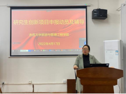 2022年4月17日上午10点30分,旅游与管理工程公司科研创新项目申报动员及辅导会在2312教室举行。本次会议是公司副经理粟娟教授主持,采用线上、线下相结合的方式同时进行,2021级旅游管理专业全体同学参加了此次会议。