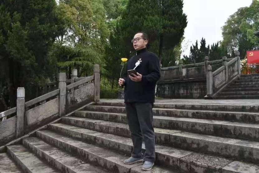 在烈士陵园纪念碑前,由公司党委副书记李军为此次活动致词:在这个有着3000多名革命烈士的城市,我们在纪念碑前祭奠他们,就是要继承革命先烈的意志。